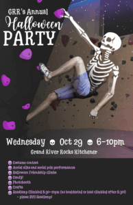 Costume contest Aerial silks and aerial pole performances Fun Halloween climbs Candy! Photobooth Crafts Headlamp Climbing 830-10pm (no bouldering or lead) – please BYOHeadlamp! – (1)
