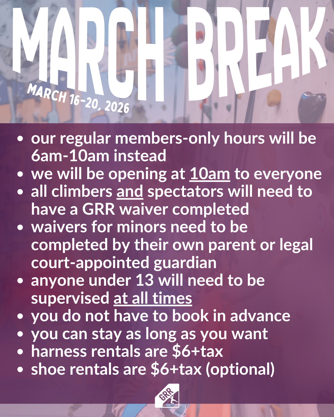 We are the premier indoor climbing gym in Kitchener, Ontario. We have bouldering, top-rope/lead, and auto-belay routes of various difficulty from beginner to seasoned climbers. We offer youth camps, youth programs, parties, guided climbs, and lessons.