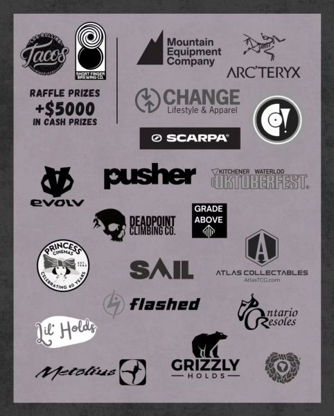 Raffle prizes for non-finalists from Arc’teryx, Atlas Collectables, ClimbOn!, Change Lifestyle & Apparel, Deadpoint Climbing Co., Evolv, Flashed, Grade Above, Lil’ Holds, Mountain Equipment Company, Metolius, Ontario Resoles, Oktoberfest, Princess Cinema, Sail, Scarpa, Yerba Mate.