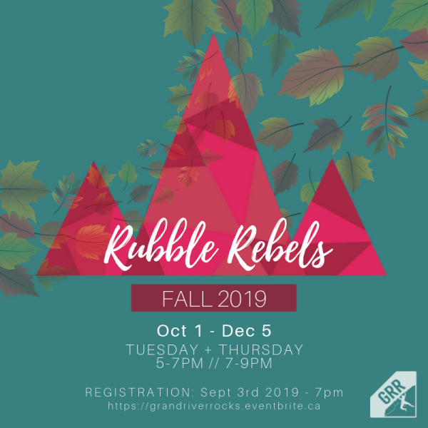 The EVENTBRITE ticket only reserves a spot in Rebels. Once the ticket(s) are acquired on EventBrite, payment and forms (link below) must be submitted to Grand River Rocks by September 20th or your spot will be forfeited to the next person on the waitlist. Maximum number of spots per reservation: 2